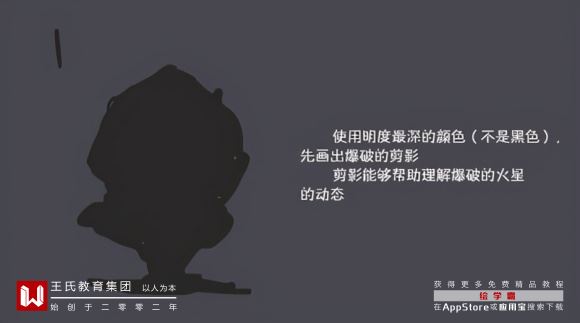 使用明度最深的颜色(不是黑色),先画出爆破的剪影