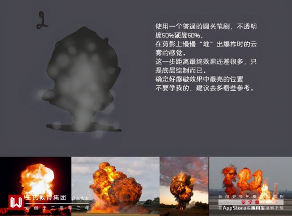 使用一个普通的园头笔刷,不透明度S0%硬度SO光,在剪影上慢慢“堆”出爆炸时的云雾的感觉.
