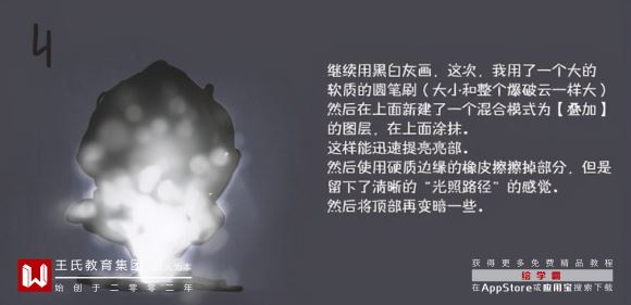继续用黑白灰画,这次,我用了一个大的软质的陶笔刷(大小和整个爆破云一样大)然后在上面新建了一个混合模式为【叠加】的图层,在上面涂抹,