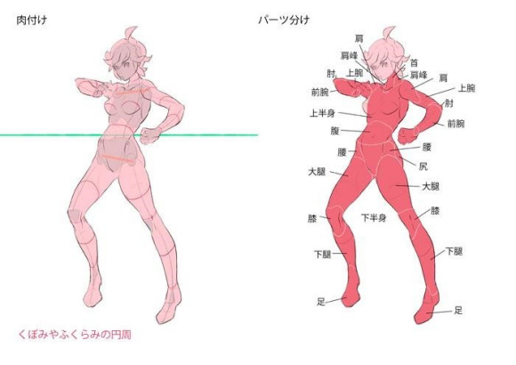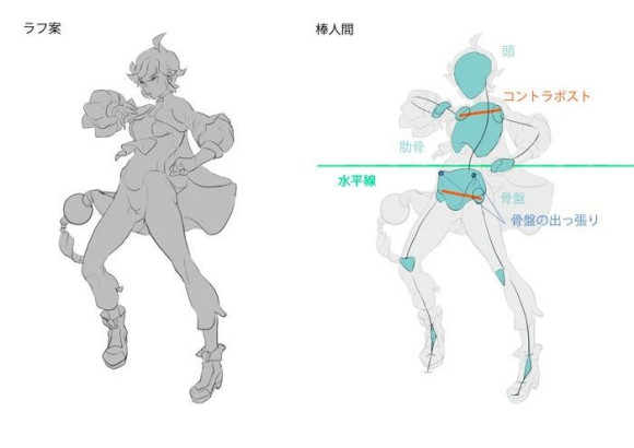 首先,确定地平线并仅粗略绘制头部,肋骨和骨盆骨头。如果您知道位置,也可以将骨盆隆起作为参考。另外,要注意构图。