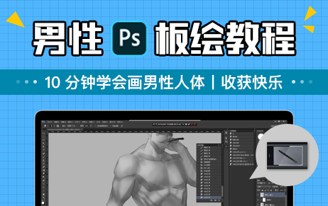 黑白人体板绘教程丨男性素描基础绘画丨PS板绘教程 丨CG电脑绘画教程